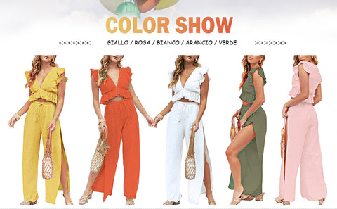 ★★★ Split pants are all about relaxed, the resort feels! made from a super lightweight fabric, high waisted style, featuring an elasticated waist with drawstring, gold bead details, wide legs, and full length splits at sides.